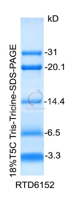 本產(chǎn)品包含預(yù)染的3種多肽和2種低分子量蛋白質(zhì)組成,分子量大小范圍為~3. 3,~6.5,~14.4,~20.1,~31 kD。可以用于直接觀察蛋白質(zhì)電泳狀況以及清晰地判斷Western Blot的轉(zhuǎn)膜效果。經(jīng)Tricine-甘油SDS-PAGE凝膠電泳時(shí)以及轉(zhuǎn)移到PVDF或NC膜上可看到清晰的5條藍(lán)色的蛋白條帶。以每次上樣10 μl計(jì)算,該產(chǎn)品可以使用20次。