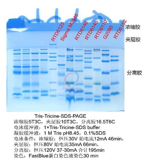 注:多肽染色可以用配方7和8(表二)進(jìn)行染色和觀察。如果使用該配方進(jìn)行染色時(shí)效果不好或考慮其毒性,請(qǐng)選擇FastBlue蛋白染色液(Cat No:RTD6202),該產(chǎn)品能在60分鐘之內(nèi)完成蛋白的染色,不至于小肽在染色和脫色中從凝膠中脫離,是常規(guī)染色液的理想替代品。